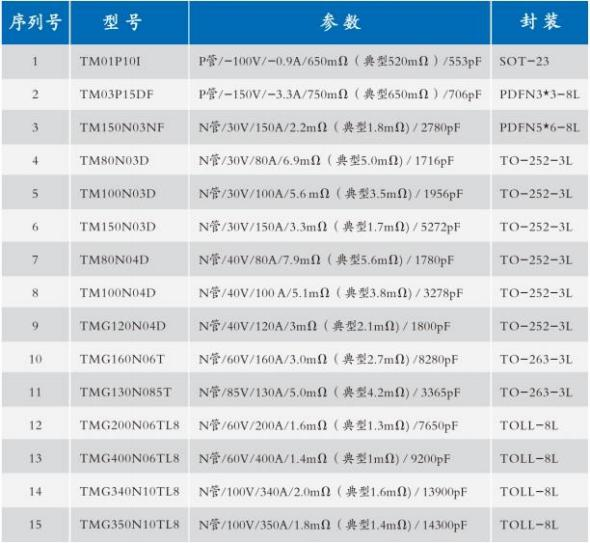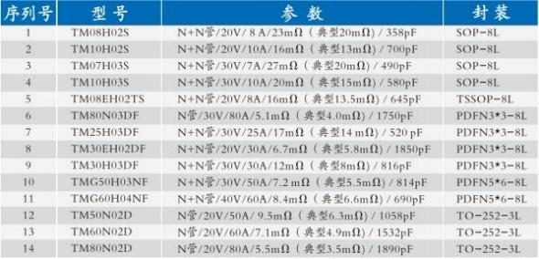 台懋半导体针对锂电池保护模块中MOS管应用,在电池保护板、3C数码锂电池保护板、电动工具锂电池保护板3个领域,有超30种型号可供选择,最高能达到100V/350A,覆盖了市面上大多数应用的需求,如图3